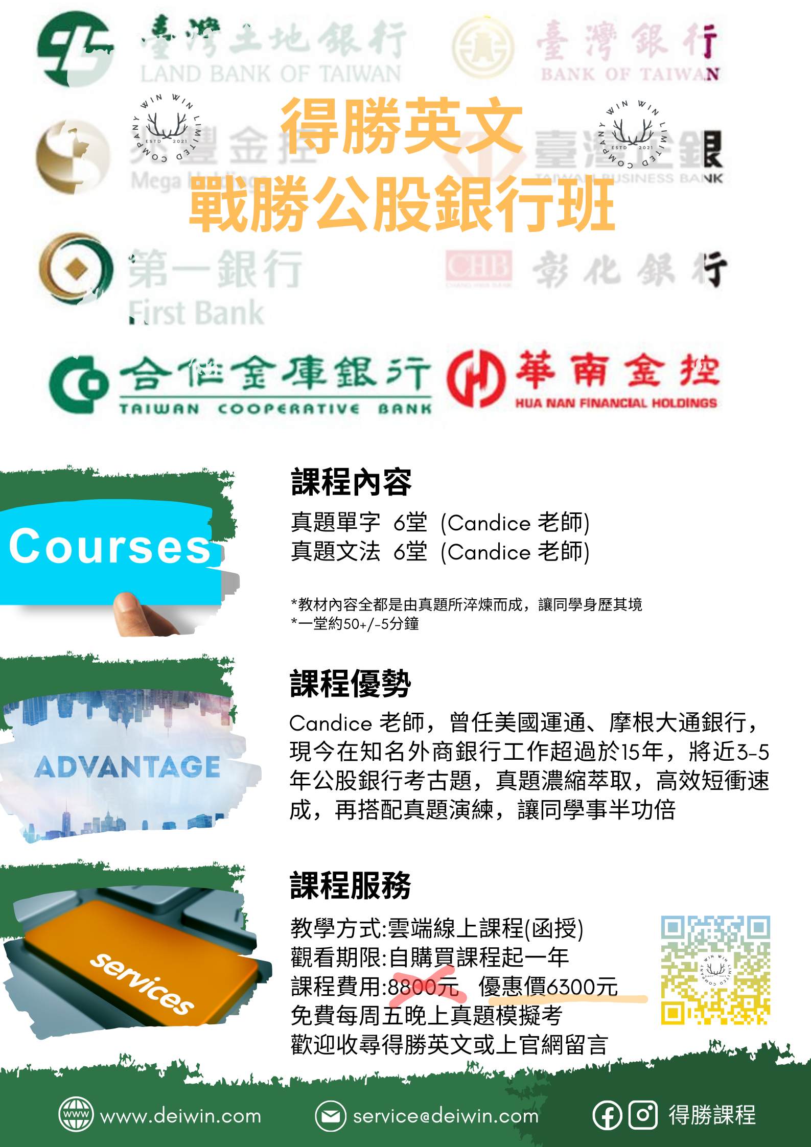 特別收錄與分析八大公股行庫及全國農業金庫(臺灣銀行、土地銀行、合作金庫、第一銀行、華南銀行、彰化銀行、兆豐銀行、台灣企銀)的考古題,設計出能讓同學快速進步的精要秘訣;第一步只要能夠熟悉與記下課程中,精挑細選的550單字及常出現的文法的題型,短時間內就能突飛猛進,讓你的英文不在是落後的科目。